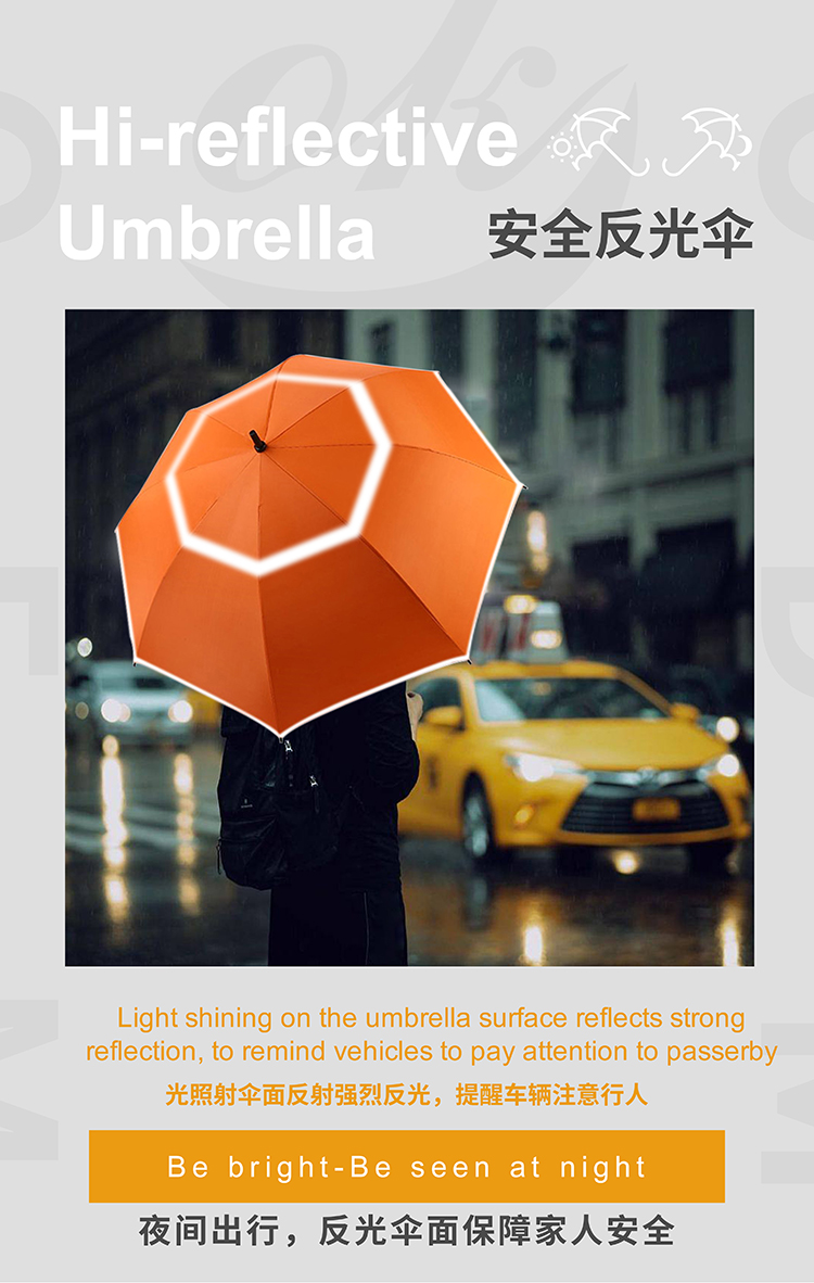 夜間出行的安全問題越來越受到(dào)消(xiāo)費者的關注,而(ér)這款單安全反光圈的雨傘,如天使環般時刻嗬護和報障大家的(de)出行安全。