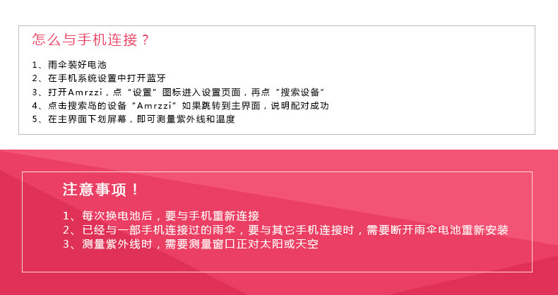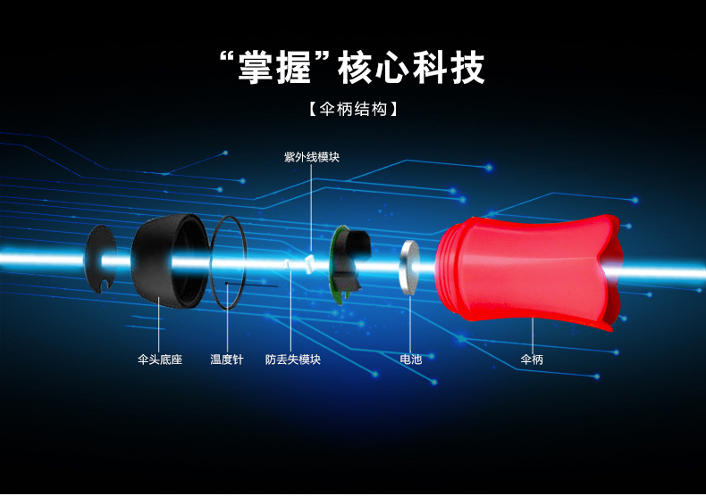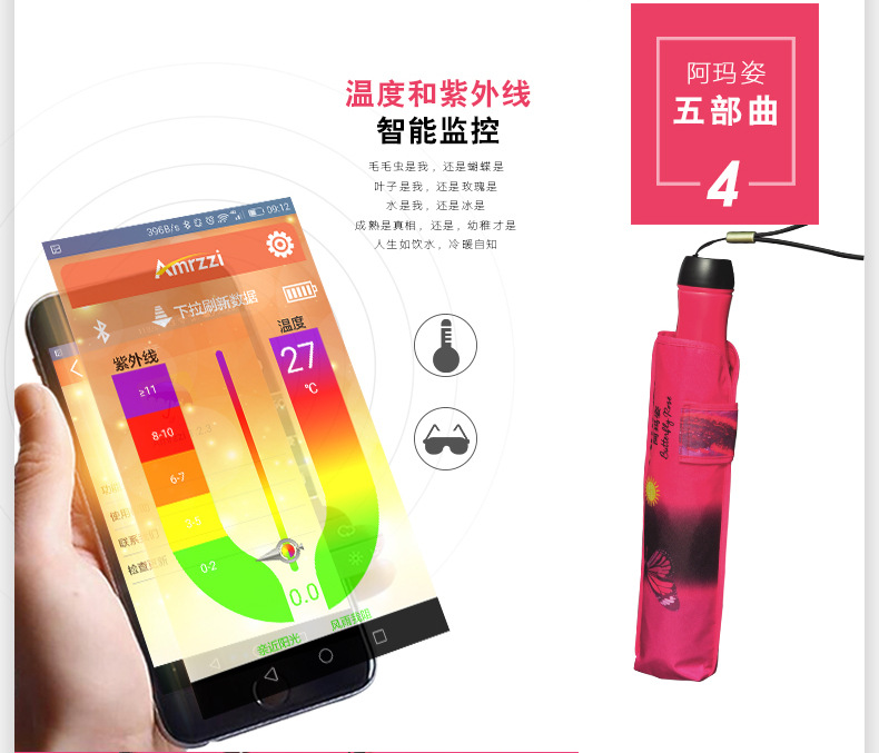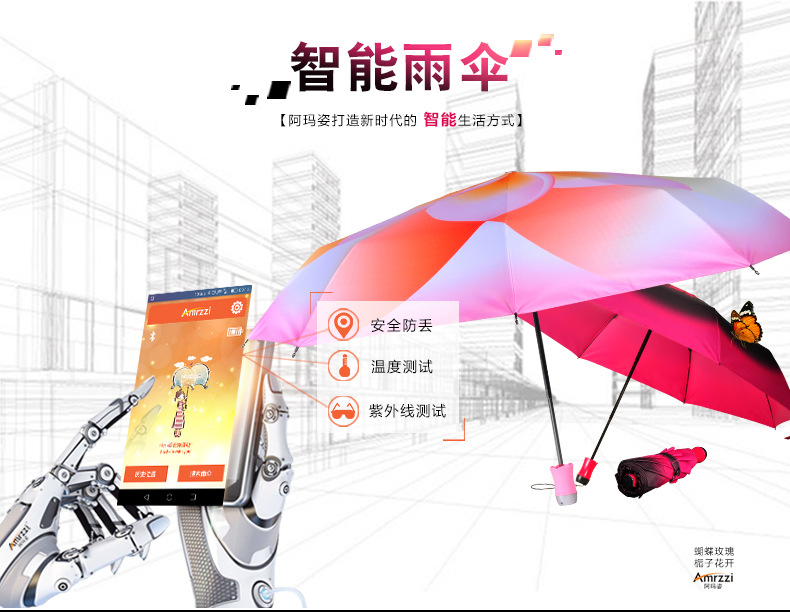 【特性(xìng)】智能雨傘防丟,紫外線溫度實時監控