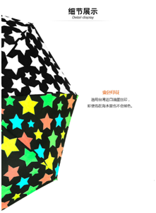 看似平常的一把變色傘,卻能給你的生(shēng)活帶來很(hěn)多樂趣。它能讓你在朋友麵前跟別人不一樣(yàng),能給你增加好感(gǎn)度。人們(men)都會有情(qíng)緒,如果心情不好,在雨(yǔ)傘上撒點(diǎn)水,發泄發泄情緒,而後又看到傘麵顏色慢慢變成彩(cǎi)色,瞬間不好的情(qíng)緒就會隨著變色傘(sǎn)而消失(shī)。如果再(zài)遇到下(xià)雨天,有點濕的路(lù)麵,變暗的天空,人們又撐著雷同的傘,當時的你會是怎樣(yàng)心情呢?但是(shì)你如果有擁有一把美(měi)麗的(de)、跟其他人都不一樣的會(huì)變色的(de)雨(yǔ)傘,而(ér)你撐著它走在雨中,不再步伐匆匆,煩悶心情便一掃而空(kōng),任誰都會對下雨天開始有所期待。