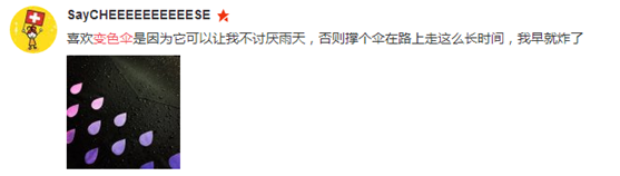 其實也有很多人不(bú)喜歡雨天,因為雨傘有的會讓(ràng)人低沉,悲傷(shāng)感爆發,變色傘還有治愈的神奇功效,你知道嗎? 網友說;希望變色傘是因為它可以讓我不討厭雨天,否則撐個傘在路上走那麽長時間,我早就炸了,是的。我也覺得。