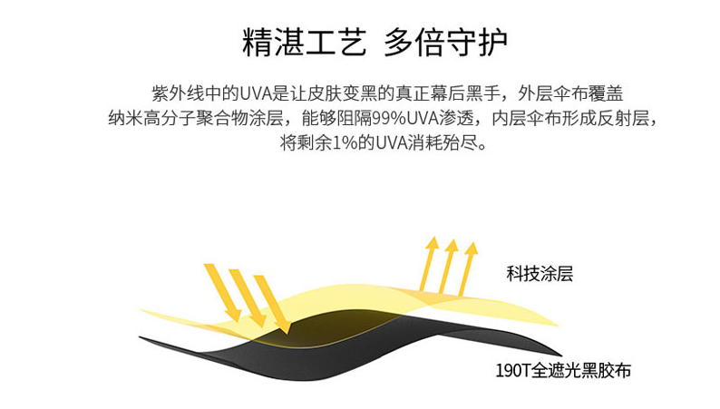 一般的防紫外線雨傘怎麽區分它的(de)好與不好呢?其實業(yè)內(nèi)早就清(qīng)楚,防(fáng)曬塗層效果最好的是黑膠,其中(zhōng)以全遮光黑膠是最好的,其(qí)次是半遮光黑膠(jiāo)與銀(yín)膠相(xiàng)差不是很多,最後是色膠。 一把好的(de)遮陽傘能夠為我們的(de)小姐姐們阻擋掉99%的紫外線,讓你整個夏(xià)天從頭白到尾。俗話說的好:一白遮百醜,一胖毀所有啊。