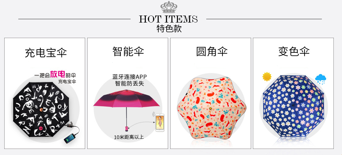 她率先同行開(kāi)發出充(chōng)電寶傘、智能傘、圓角傘、變色傘,現又開發出一款一甩幹雨傘,為(wéi)解決下(xià)雨天雨傘濕身的煩惱。