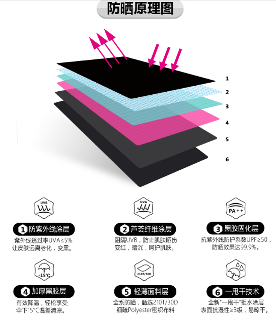 黑膠固化層(PA+++),抗紫外線防護係數UPF>50,防曬效果達(dá)到99.99%,加厚的黑膠(jiāo)塗層降溫效果一級棒,輕鬆享受傘下(xià)15度溫差(chà)清涼。