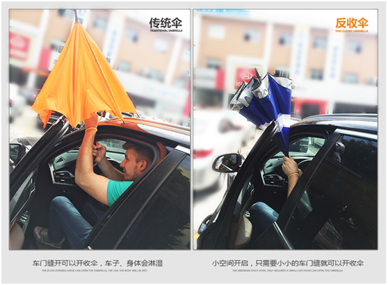2. 最小(xiǎo)空間開(kāi)合(hé),設計更符合人體工(gōng)學,上下車時可以以(yǐ)最小的空間開合傘,降低人與車的濕身程度。