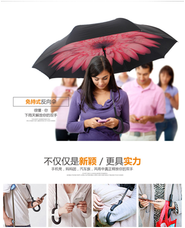 那麽這把反向傘好在(zài)哪裏呢(ne)? 1. 反向設計,收雨傘時,將濕(shī)噠噠的傘麵(miàn)向內收攏,收攏後傘的外表(biǎo)麵是幹(gàn)爽的內層傘(sǎn)布,這樣在擠公交或者擠(jǐ)地鐵上就不再也不用為濕傘碰(pèng)到自己(jǐ)或他人的衣服而煩惱了。