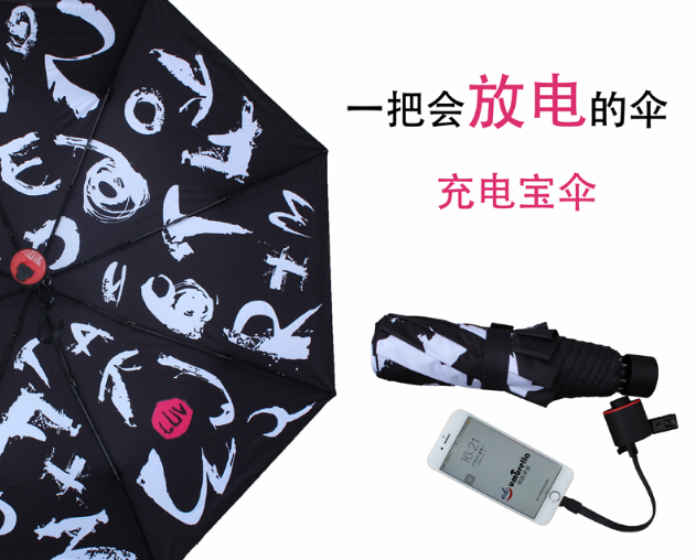 這款傘(sǎn)可以說是非常有個性,這個一點都不誇張的呢,傘與充電寶相結合(hé)一(yī)體的工具,在這裏的充電寶不隻是充電寶,還作為(wéi)雨傘的傘柄,雨傘的一個配件使用。實現雨傘既可以遮陽防曬,雨天遮(zhē)雨的效果,還能在你手機電量不足的時候,給你滿滿的安全感喲,阻止手機罷工哈。